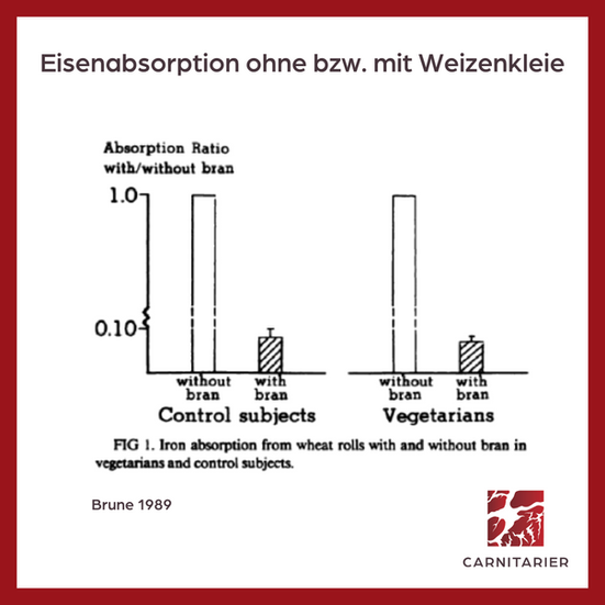 Insbesondere zu Eisen aus pflanzlichen Lebensmitteln hat die Phytinsäure eine große Affinität, nicht so bei Hämeisen aus tierischen Lebensmitteln. Das erklärt den wesentlich größeren Eisenmangel bei Vegetariern gegenüber Fleischessern trotz der an und für sich nicht großen Unterschiede bei der Aufnahmemenge von Eisenmolekülen [2]. In einer Studie von Brune wurde gezeigt, dass Weizenkleie die Eisenabsorption um 90 % hemmt [3].