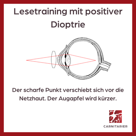 Dass die Länge des Augapfels durch das Tragen einer Brille mit positiver Dioptrie aber wieder verkürzt werden kann, zeigt eine Studie von Scott Read aus dem Jahr 2010.[2] Es gilt also folgendes Training durchzuführen: Beim Kurzsehen, also beim Lesen, sollte man ohne Sehhilfe trainieren und zwar idealerweise in dem Abstand, in dem das Lesen gerade noch mit ausreichener Schärfe möglich ist. Zusätzlich kann man als Übung eine Brille mit positiver Dioptrie, also eine Lesebrille aufsetzen, die einem das Scharfsehen erschwert. So verschiebt man den scharfen Punkt wieder vor die Retina und das führt auf lange Sicht wieder zu einer Verkürzung des Augapfels.